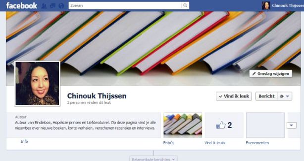 Misschien werd het wel een keer tijd, een aparte Facebook-pagina voor mijn boeken, korte verhalen en alles wat hiermee te maken heeft. Dus, bij deze. De enige ‘vind ik leuks’ zijn tot nu toe die van mijzelf en van mijn moeder. Natuurlijk zou ik het leuk vinden (en het zou handig zijn) als jullie je ook aanmelden om op deze manier op de hoogte te blijven!