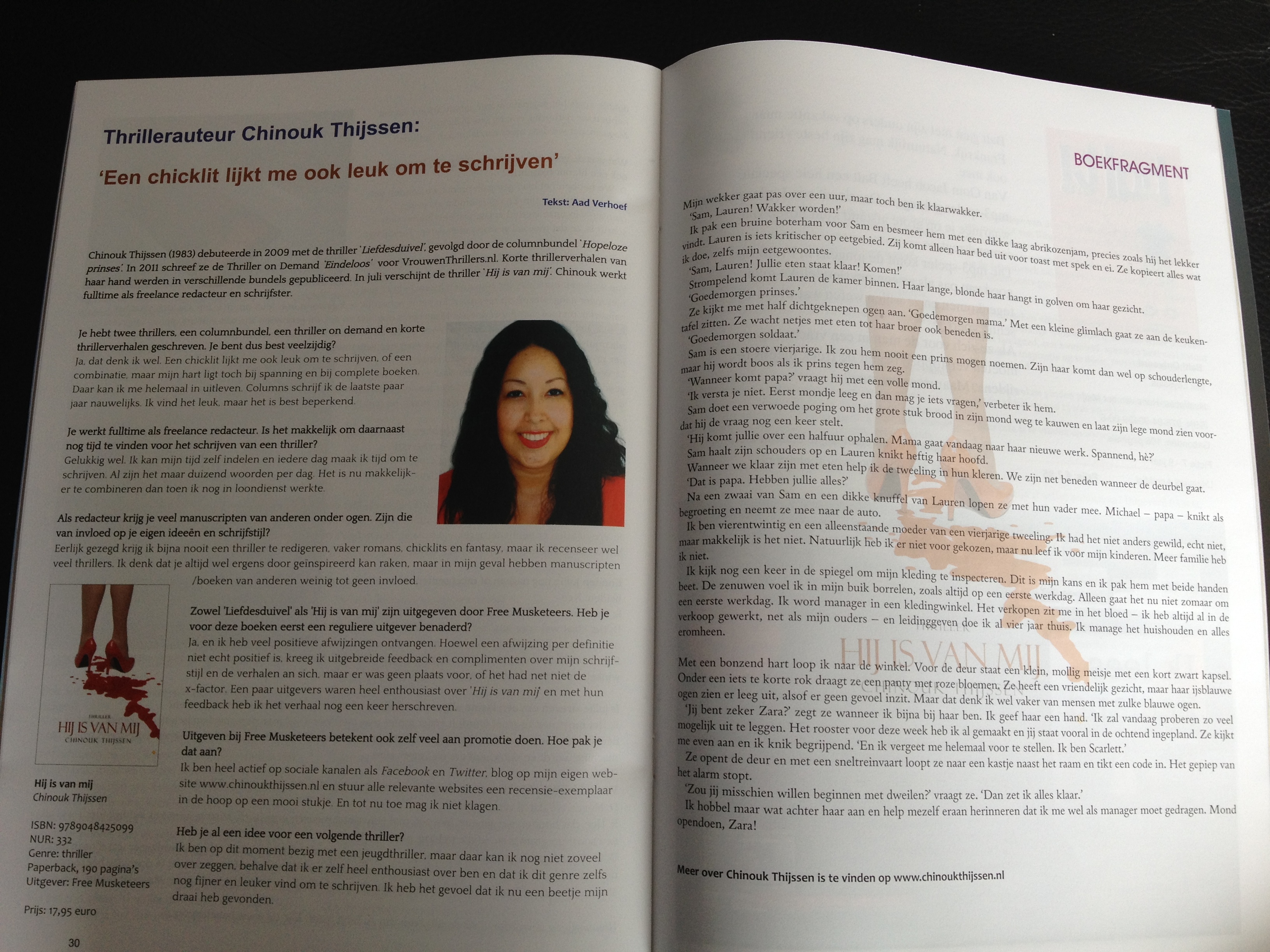 De glossy staat vol met interviews, recensies, kortingsbonnen, voorpublicaties, winacties en een feuilleton. Ik ben heel erg blij en trots dat de redactie twee pagina’s heeft gevuld met informatie over mijn nieuwe boek Hij is van mij. In dit zomernummer vind je namelijk een interview met mij en een boekfragment.