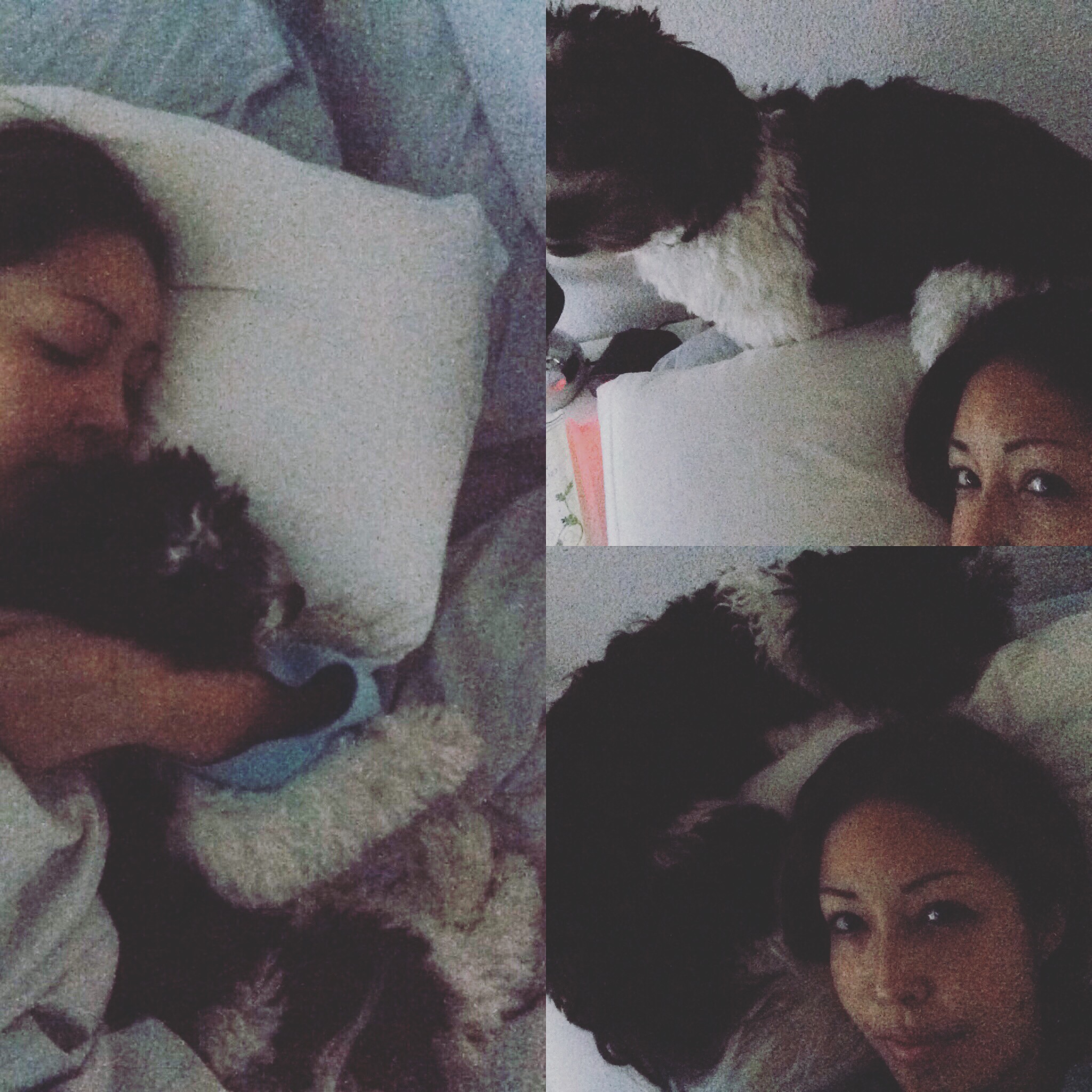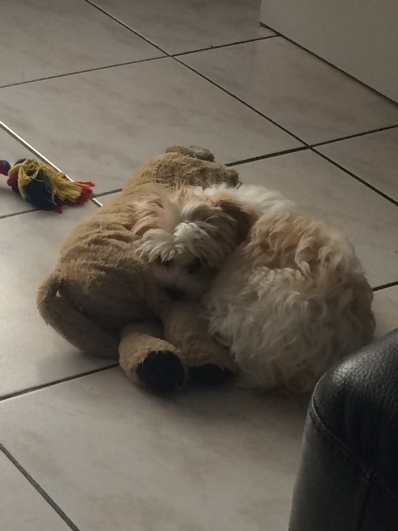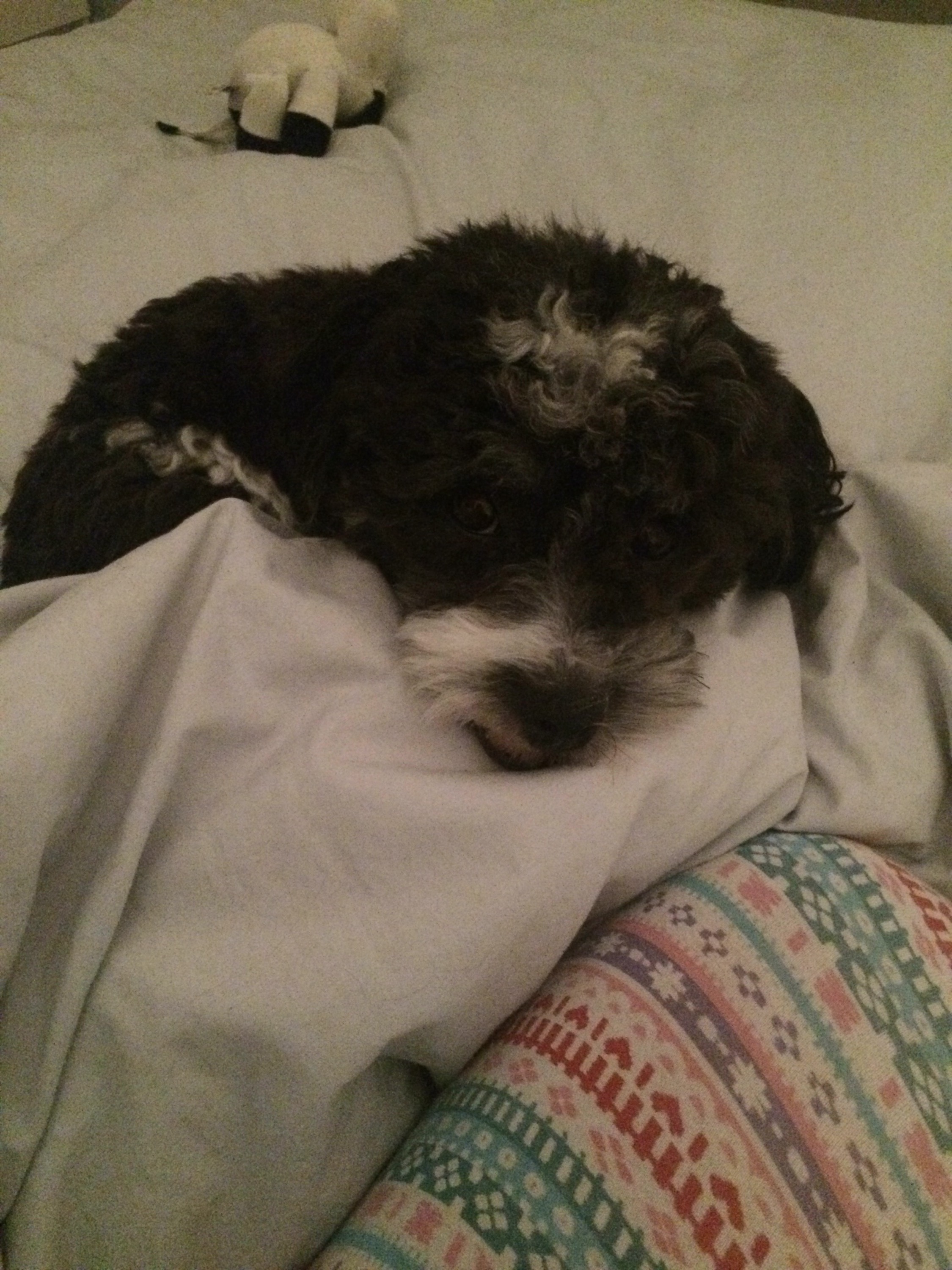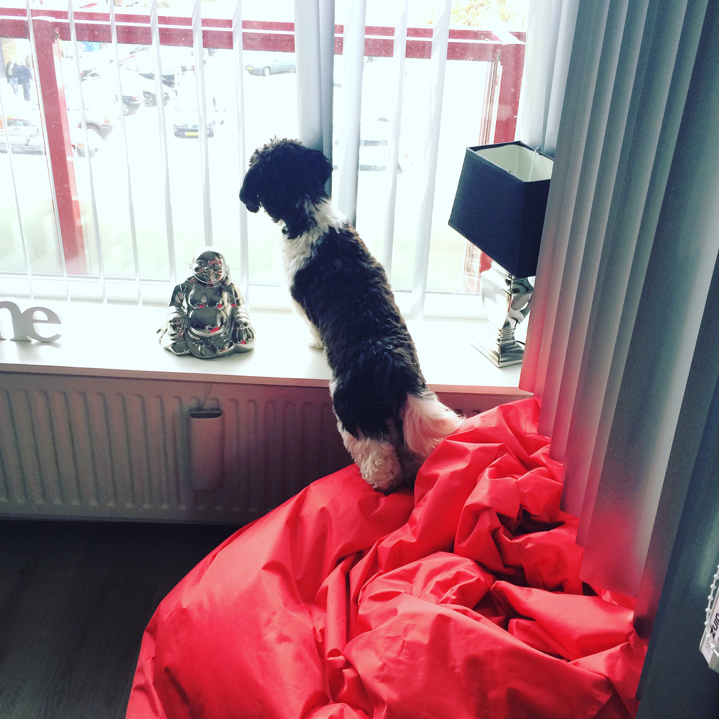 De Ikea-hond die ik voor Cosmo had gekocht is bij Blanche ook favoriet. Ze kan er uren heerlijk tegenaan liggen.