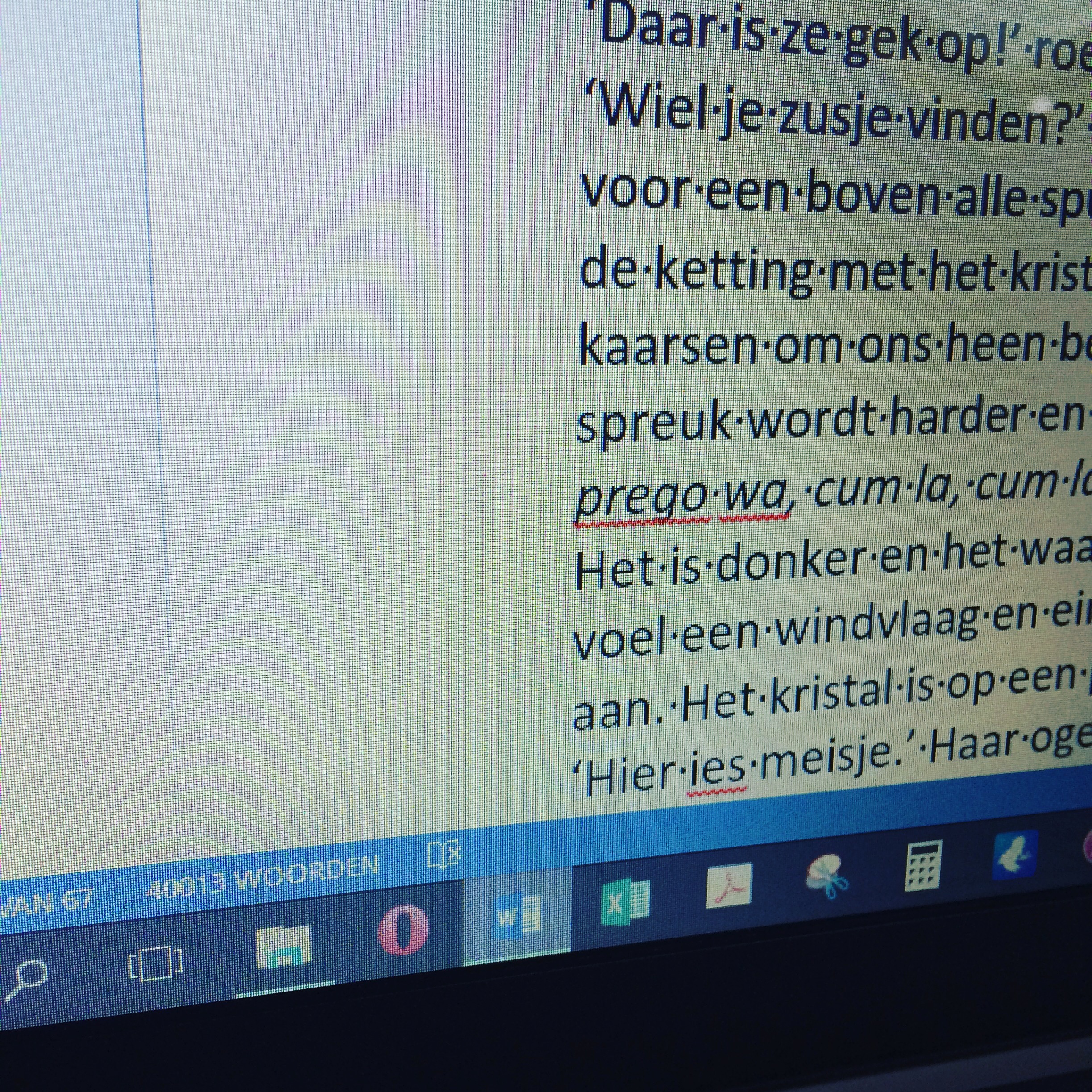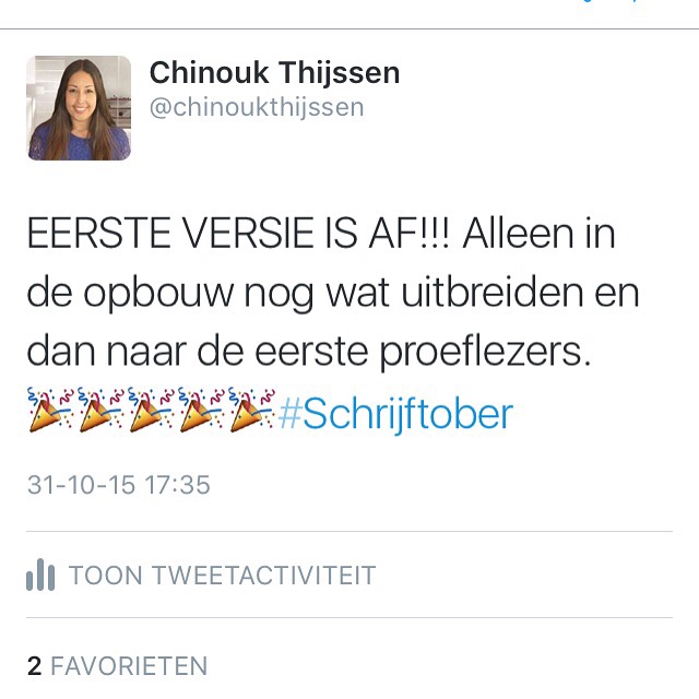 TADAAAA! De eerste versie heeft iets meer dan 63.000 woorden (zonder dankwoord) en ligt inmiddels (in november) bij de proeflezers. Thanks to Schrijftober heb ik mijn derde YA-thriller afgerond. Het einde heeft mij verrast, ik wist tijdens het schrijven nog niet precies hoe het af zou lopen.