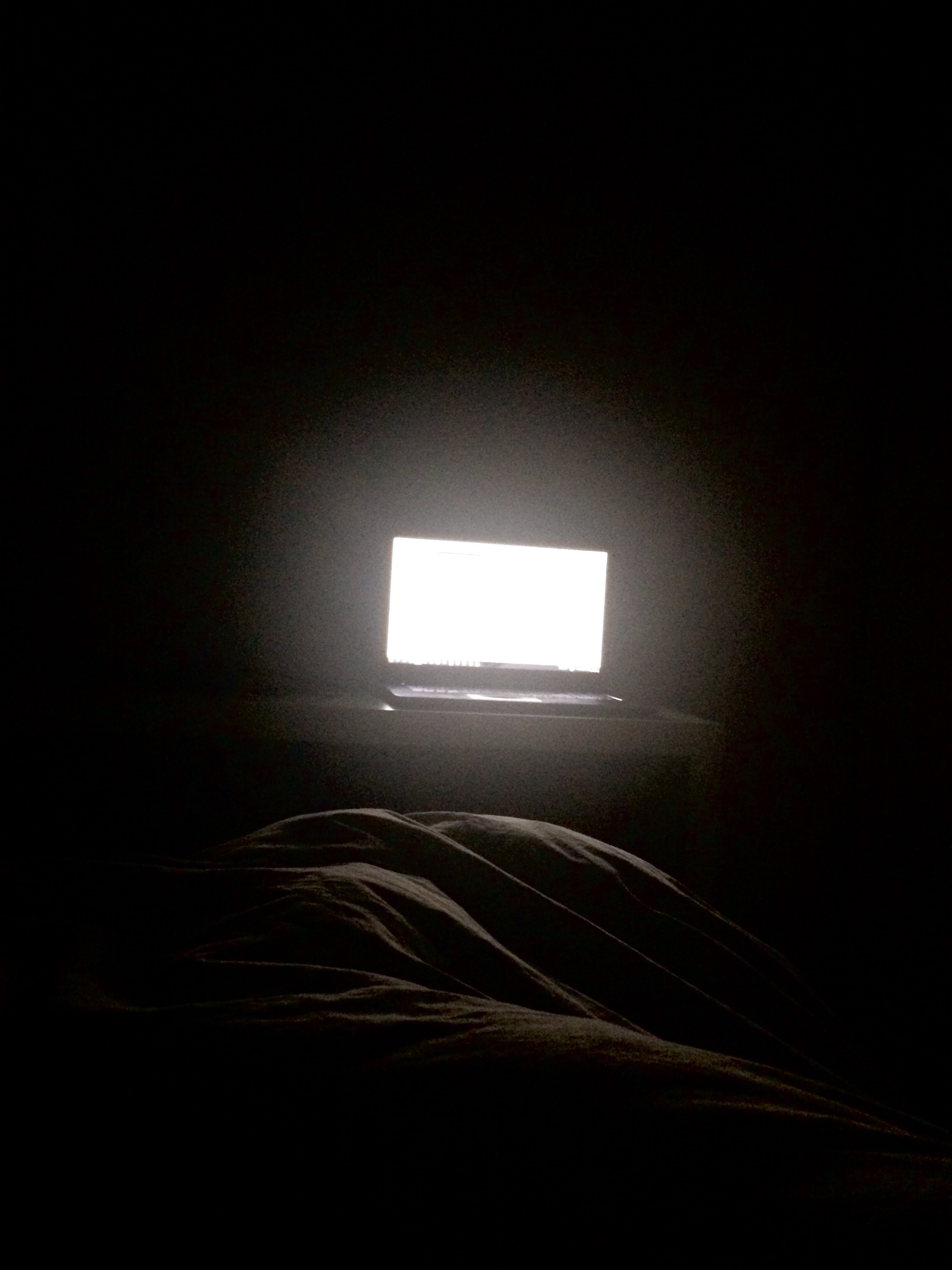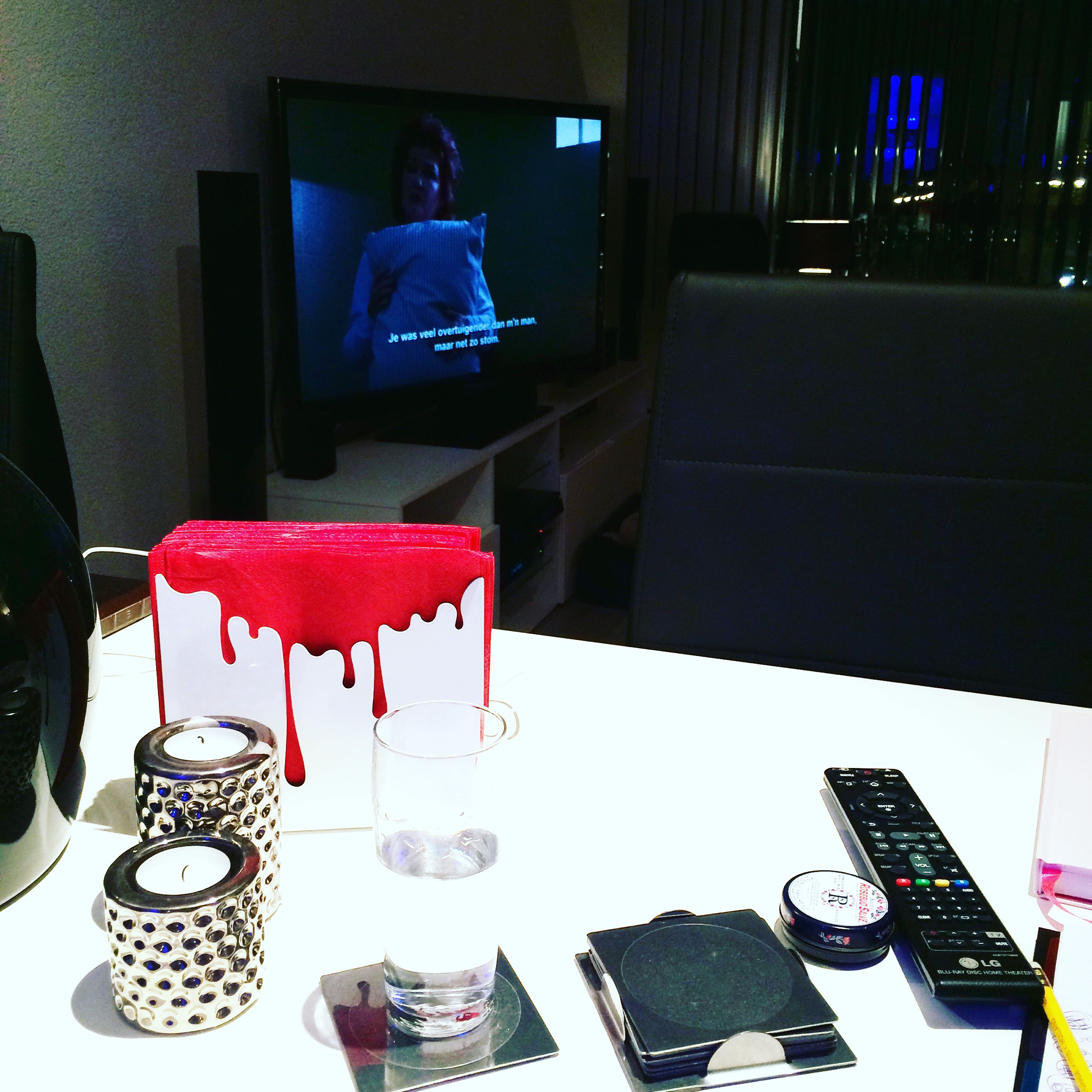 ’s Avonds doorwerken, maar mijn kantoor had ik even verplaatst naar de woonkamer. Op de achtergrond het derde seizoen van OITNB.