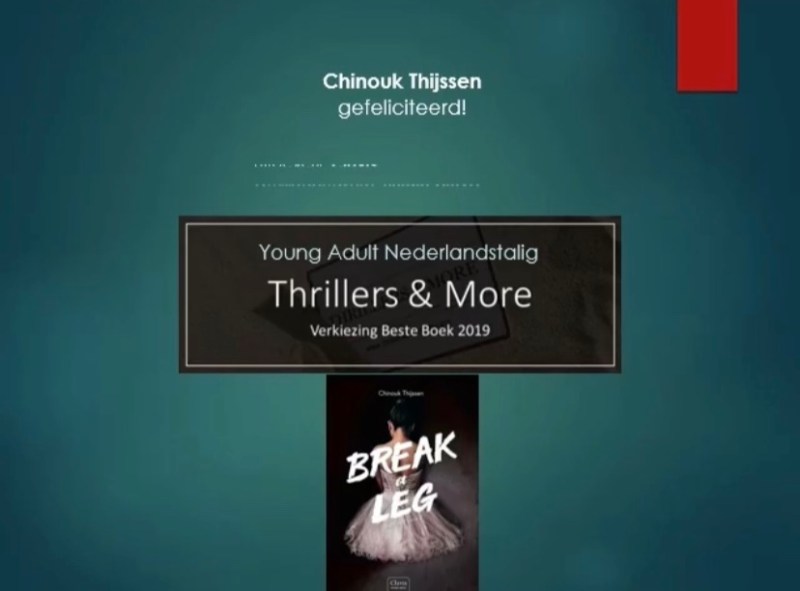 Break a Leg heeft gewonnen in de verkiezing Beste Young Adult Nederlandstalig van Thrillers and More! Iedereen bedankt voor het stemmen.