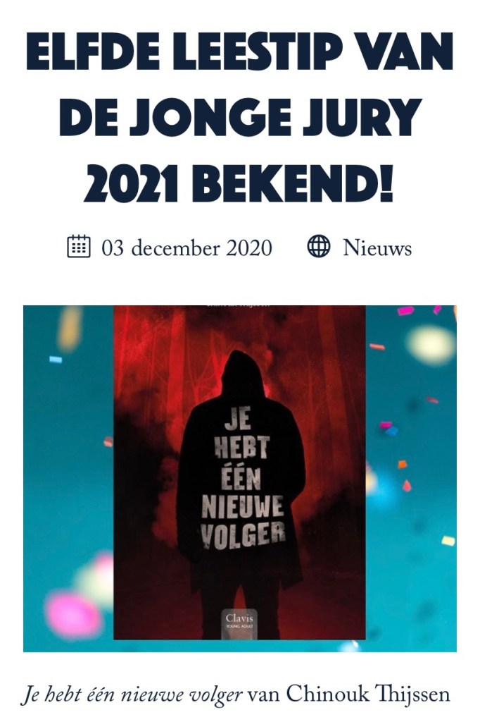 Wat is dit lang een grote droom geweest. Op de tiplijst staan van de Jonge Jury. Genomineerd zijn voor de Jonge Jury-prijs. En met mijn nieuwste YA-thriller is dat nu gelukt! Mijn boek heeft de Jonge Jury Wildcard Wedstrijd gewonnen en is daarmee de elfde leestip geworden, waardoor de tiplijst vol genomineerde boeken nu compleet is. š„³