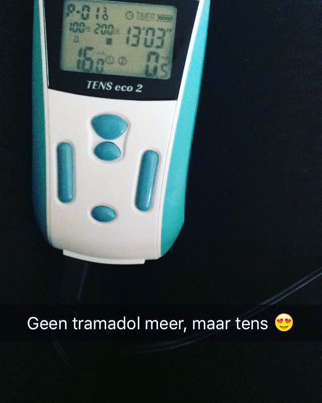Omdat ik na een paar dagen ziek werd van de tramadol (is ook niet zo gek) mocht ik de tens van mijn moeder gebruiken. Dit kastje werkt pijnstillend door het gebruik van stroomstootjes. Het helpt echt heel goed.