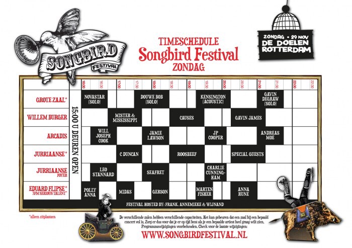 Zondag ging ik met mijn zusje naar het Songbird Festival. We gingen vooral voor de artiesten in de Grote Zaal, maar we wilden ook graag Gavin James eens zien. Dat lukte dus niet, want als je de Grote Zaal verliet was er een grote kans dat je er niet meer in kwam. Zo verliet ik de zaal na het optreden van Douwe Bob om naar de wc te gaan en drinken te halen. Mijn zusje bleef achter en mijn jas liet ik op mijn stoel liggen. Bij de toiletten ving ik op dat niemand de Grote Zaal meer in kwam omdat het al vol was. Ik besloot de drankjes dus maar achterwege te laten. Ik had natuurlijk wel al een plekje, dus ik ging ervan uit dat ik zo door kon lopen. Niet dus. Ik heb drie ingangen moeten proberen en uiteindelijk werd ik alsnog binnengelaten.