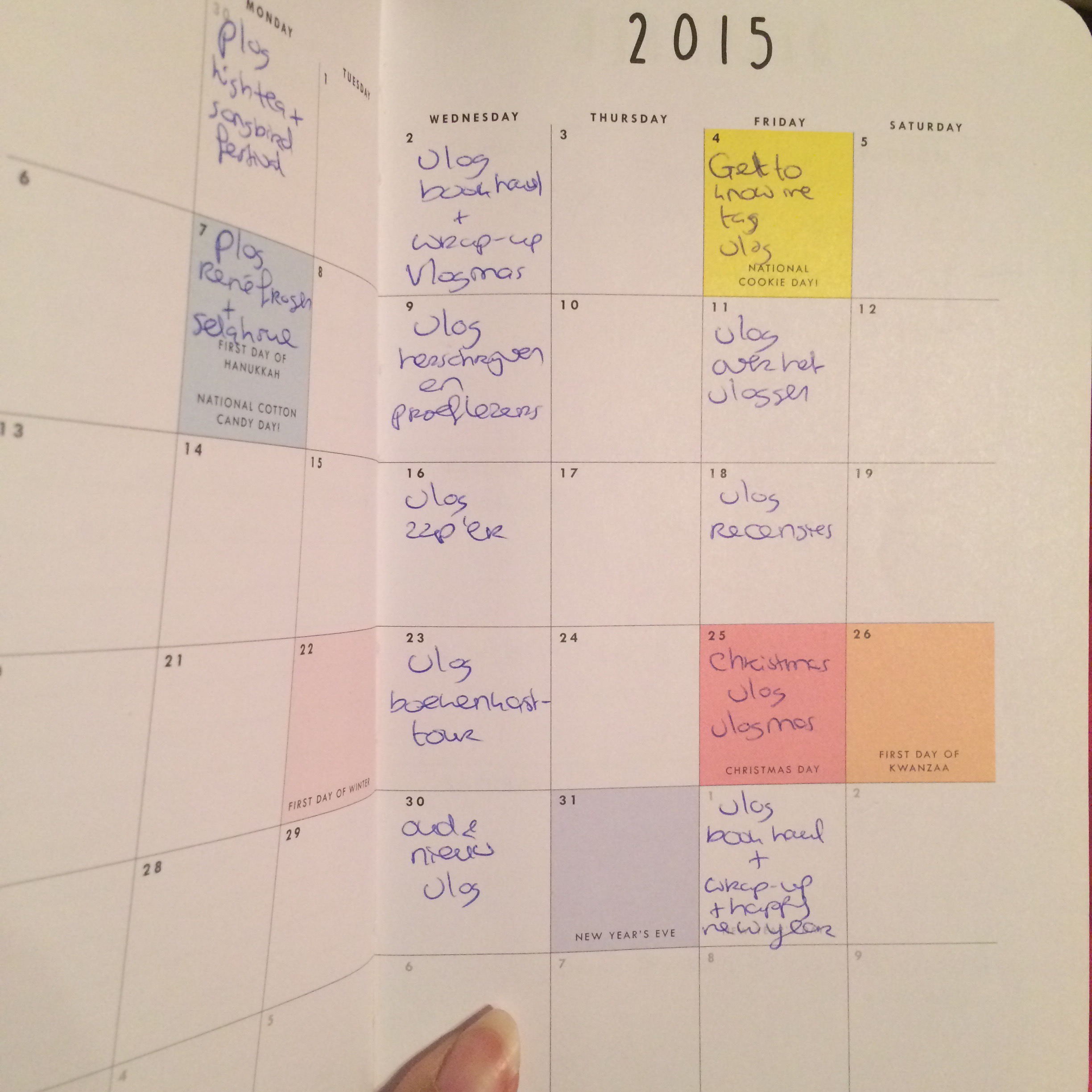 Elke maandag deel ik mijn agenda in of pas ik mijn planning aan. Nieuw is het inplannen van de plog en vlog. Hoewel er ondertussen altijd een hoop verandert. Zo heb ik het vlogschema al wat aangepast, want ik vergat even dat de uitslag van de winactie voor de kerst online moet komen. Dat wordt dus de 18e.