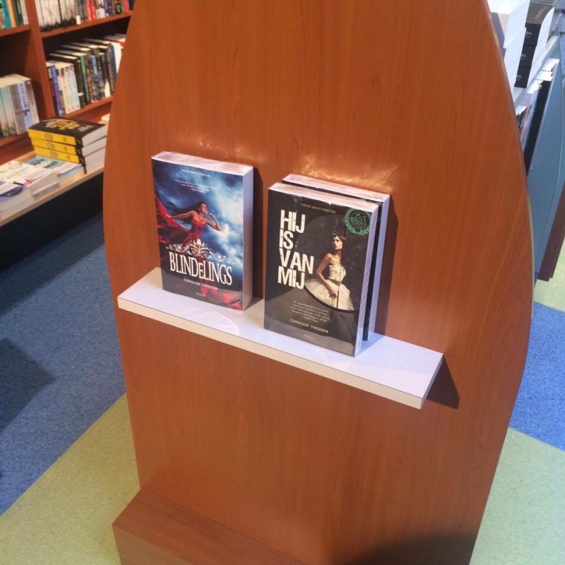 In de boekhandel Het Verboden Rijk in Oosterhout is de zijkant van deze kast nu helemaal van mijn boeken. Hoe tof is dat! Marjolein Mous van Serendipity Books stuurde mij deze foto door. Zij gaat regelmatig even kijken.